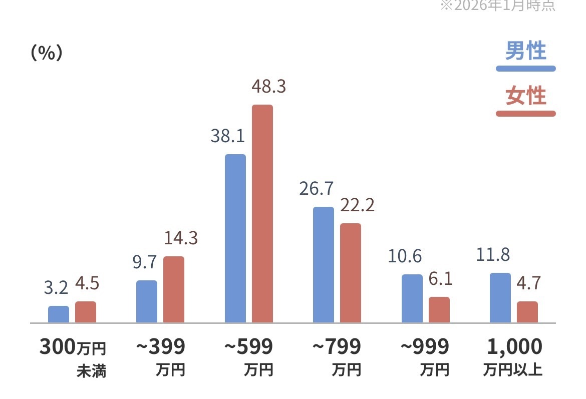 300万円未満の割合は男女ともにごく少数。