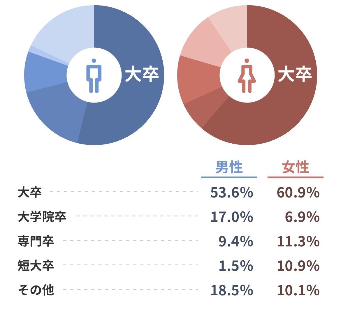 男女ともに最も多いのは「大学卒」で、