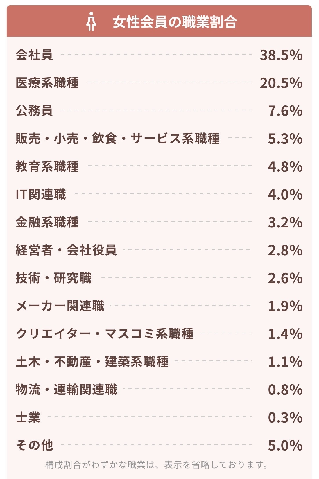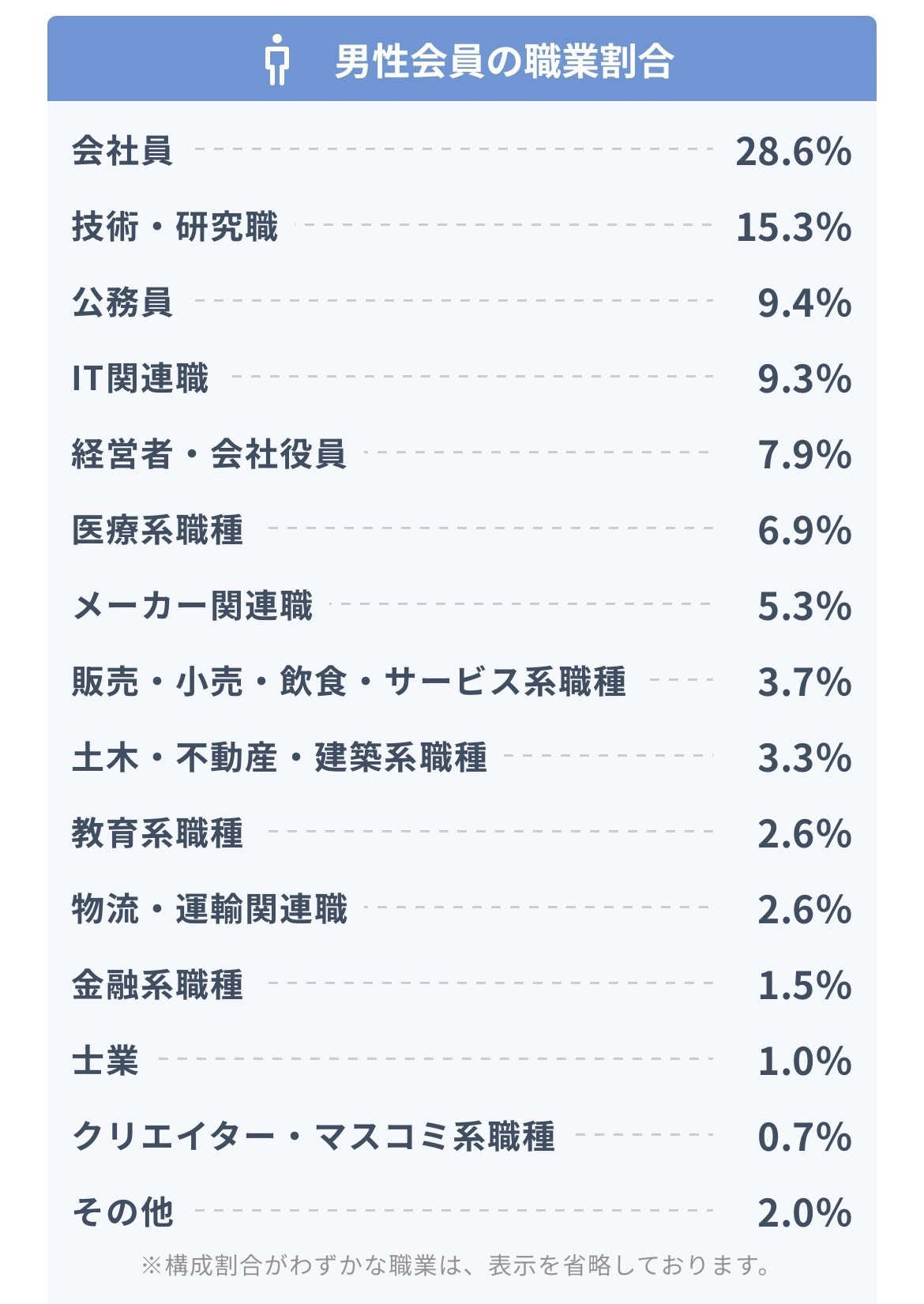特定の職業に偏ることなく、安定した職種に就いている方が中心です。